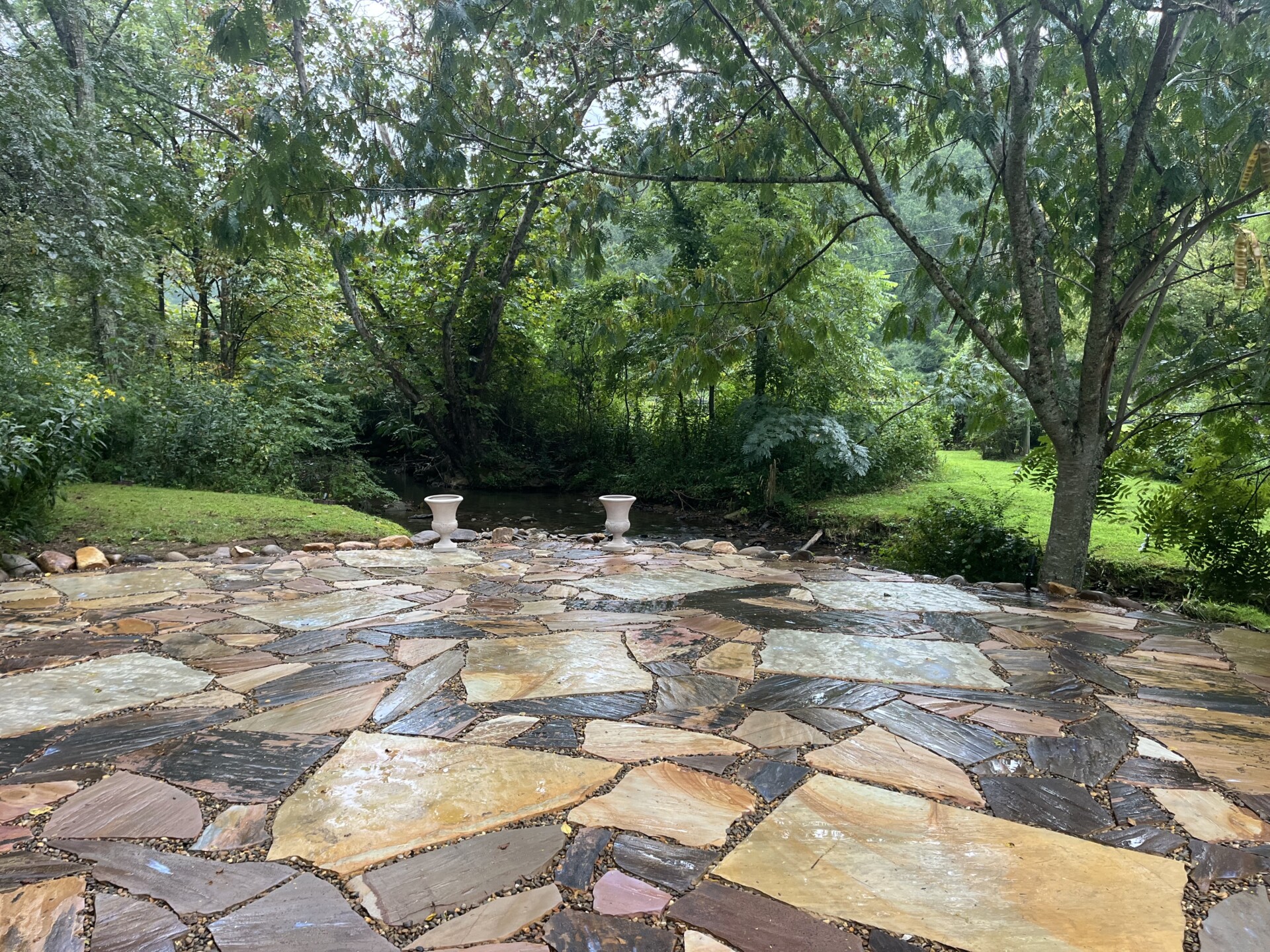 Our newest addition to 4 Points. 2500 square foot of flagstone with dappled lighting and gorgeous Birds Creek. For couples looking for a forest wedding, this is the ceremony site for you. Excited for our first ceremonies here in Spring of 2026!